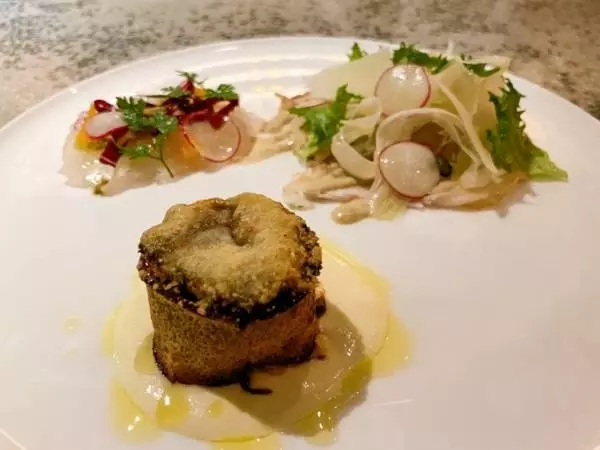 まずは、12時間キャラメリゼをした玉葱のクレープ巻をパルミジャーノソースでいただきます。そして国産ポークのポルケッタのトンナートソース添えに、京青山椒ソースの鯛のクルード。どれもフレッシュで、カクテルになじみます。