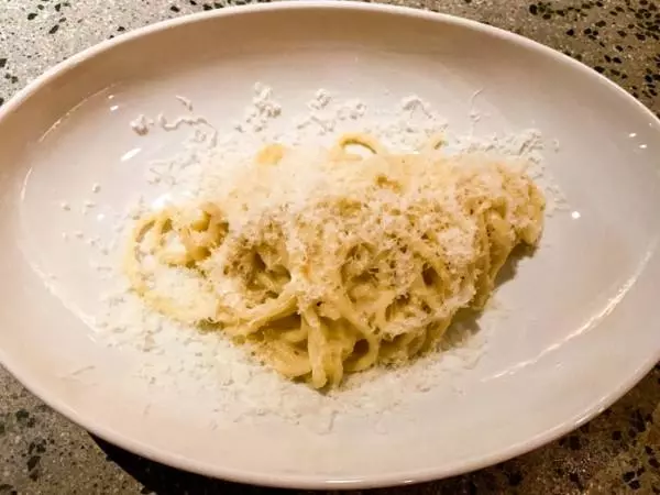次に出てきたパスタ(トンナレッリ)も実にシンプルで、チーズとブラックペッパーだけの「カチオエぺぺ」です。これも同じく、もう一皿食べられる感じ。子どもから大人まで食べやすい定番です。ワインが欲しくなり、カリフォルニアのシャルドネをいただきます。