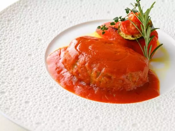 渡辺さんがフランスにいた頃の懐かしい思い出がたくさん詰まった、南仏の味わいをソースに込めています。パテは国産牛・豚の合挽きを使用、ソースはアンチョビとトマトの旨味に爽やかなレモン、ローズマリーを香らせ、パン、ご飯、パスタ……どんなお食事にもベストマリアージュする煮込みハンバーグです。