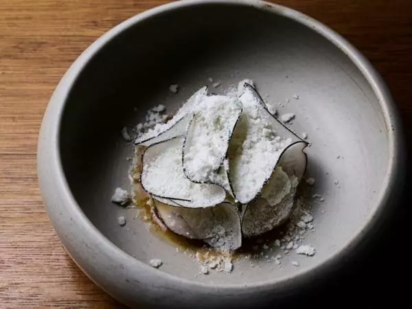 熟成じゃがいものピュレと優しく火入れをしたサワラに、ふきのとうやみょうが、生の黒だいこんなど和の食材を絶妙に用いた一皿。ゴルゴンゾーラのスノーを飾った見た目はシンプルで美しく食欲をそそります。