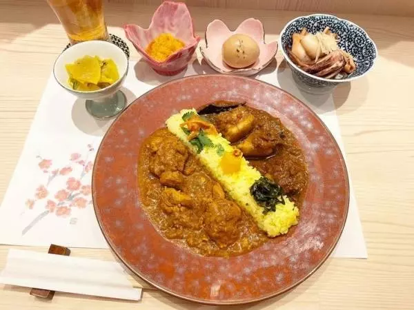女将特製のスパイスカレーは、味はもちろん、見た目にも食欲をそそるおいしい盛り付け。グルテンフリー・砂糖不使用で、スパイスからつくるこだわりの本格スパイスカレーです。こちらもおばんざいと同じく週替わりなので、何度も足を運びたくなります。