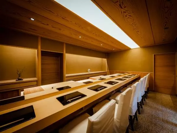 前店に比べ、店の広さは倍以上広くなったものの、席数は8席と2席増えたのみ。ゆったりと鮨を味わえる。奥には、別に、6席の個室カウンターもある