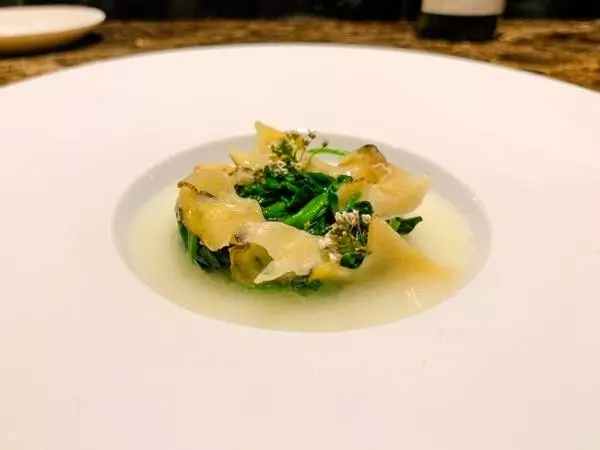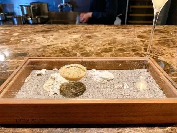 オコゼの肝が味に深みを醸し、浜辺の波のような昆布の泡ともにスプーンで救っていただきます。