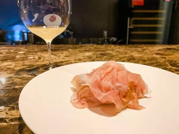 あつあつの太刀魚のフリットに生ハム。デラウエア感満載のワインはスーパーデラックス2019です。ジュース感覚で合わせます。