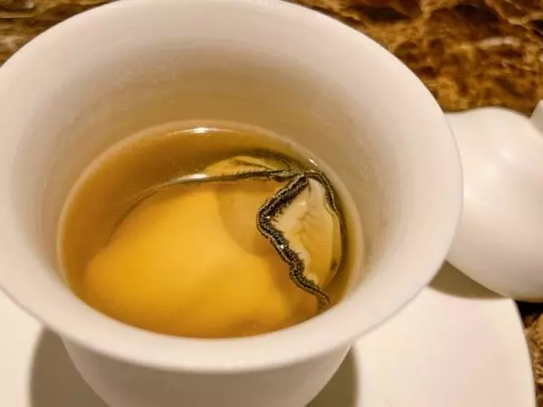 続いて牡蛎のスープです。原木シイタケ、パルマハムを山の湧き水で煮てつくった地味豊かなスープです。ごろんと大きな牡蛎は旨味の塊で、それをスープとともにいただきます。ワインがスパイシーにも感じ、面白い組み合わせです。