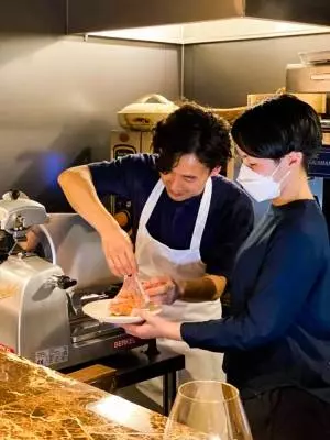 シェフがスライサーで生ハムを切り始めます。カウンターの中は奥様との2人作業。息の合った感じが微笑ましい。井上シェフが魅力的なのは笑顔で幸せそうに料理をつくること。それが伝わってくるんですね。
