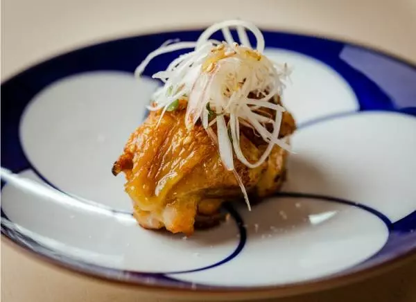 例えば膝まわりのお肉は、【鳥しき】では大きな塊にかぶりつくというダイナミックな楽しみ方ですが、ここでは焼いてから食べやすい大きさに切り、胡麻油と塩で和えた白髪ねぎ、茗荷などの薬味をトッピングして出されます。食材のダイレクトな美味しさだけでなく、他の食材が合わさった時のハーモニーを楽しむというのが焼鳥との違いなのです。