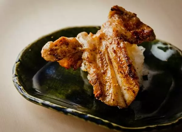 また、池川氏が稀少部位・薬研軟骨の新しい楽しみ方として、横隔膜(ハラミ)と繋がったままにするという捌き方を考案。焼くと半分くらいに縮みますが、足を広げたカエルのような形に見えることから『とりかわず』と命名したそうです。