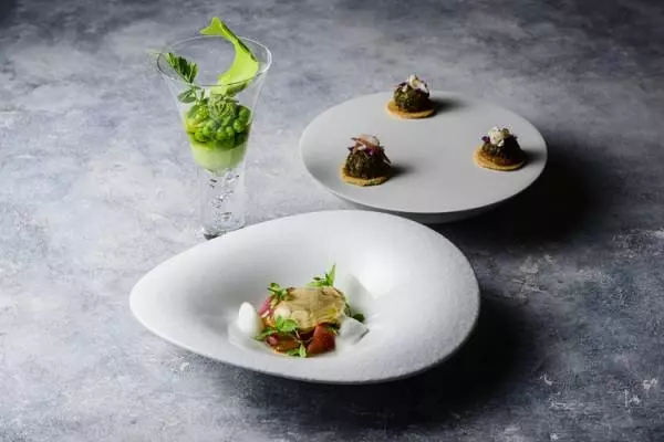 左から『豆の声』、『季節野菜のピクルスとハマグリの低温コンフィ』、『新玉ねぎと蕗の薹のタルト』