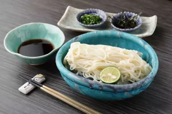 そして徳島の名産と言えば徳島の澄んだ水でつくられた『阿波白糸 半田そうめん』。のど越しがよく、他のものよりもコシが強いので、初めて食べる方は少し驚くかもしれません。つゆは鰹節をけずってつくった自家製のもの。そこへすだちを絞っていただきます。