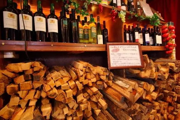 窯で使用する薪がインテリアとして飾られたオシャレな店内