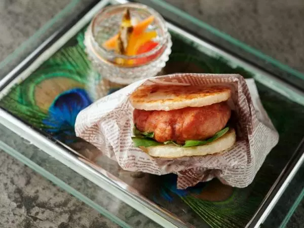 コースの締めとして喜ばれる『クジャクのライスバーガー』は、ジビエならではの素材感が魅力。クジャクの粗挽き肉を使ったパティは、臭みがなく、しっかりとした旨みが感じられます。焼きチーズリゾットで作ったライスバンズが、味わいと食感の好アクセントに。