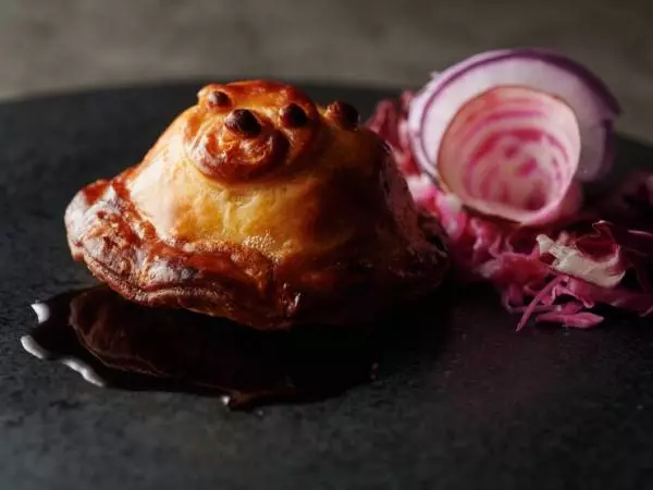 名物の『クマパイ』は、粗挽きにした熊肉の中に大ぶりなフォアグラを入れ、バターをたっぷり使ったパイ生地で焼き上げたひと品。赤ワインベースのほのかに酸味の効いたソースが、熊肉と相性ぴったり。コースのメイン料理としても人気です。