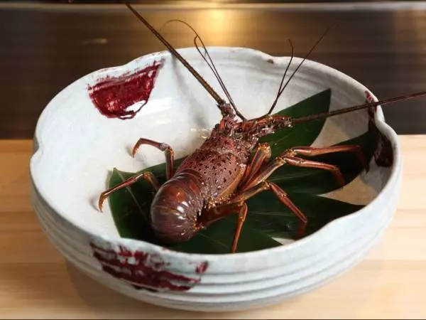 調理前に生け簀から取り出し、レアに焼きあげられる伊勢エビ