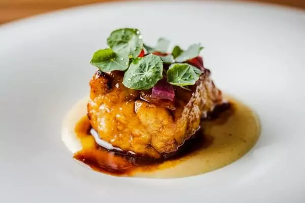 宮﨑シェフにとって、徹底的に食べ込んだ渡仏中を思い出す味。ポワレしてキャラメリゼ、シェリービネガーと白バルサミコ、ジュ・ド・ヴォーを入れたソースで。新たまねぎのピュレと赤たまねぎのピクルスを添えて。