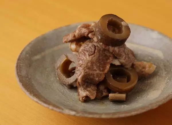 お品書きを眺めつつ、お次は『〆鰆燻製』に箸を伸ばします。鳥羽・答志島の鰆をお酢で〆て、無農薬のもち米のわらで薫香をつけたという『〆鰆燻製』。答志島の鰆は肉厚で脂が乗っており、噛むと旨味と薫香が広がります。日本酒だけでなく、薫香と相性のよいウイスキーとも合わせていただきたい。