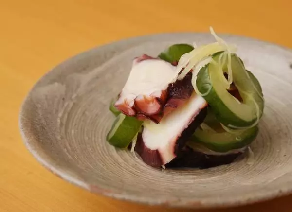 生姜とポン酢でさっぱりとした味わいですが、酸味が強すぎないので食べやすく、一手間加えられた水玉きゅうりは目にも楽しい。タコは弾力のある歯応えで、噛むと旨味が広がります。日本酒との相性もバッチリです