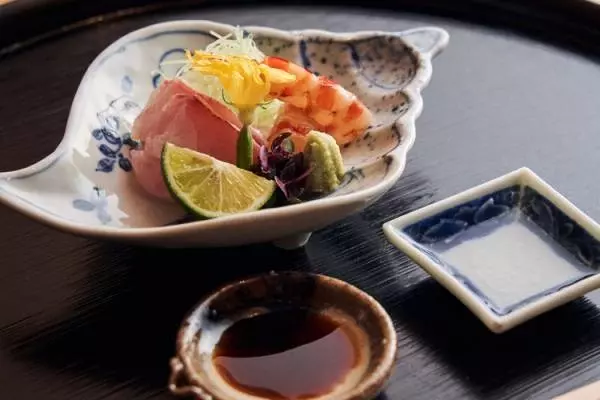 お椀の次はお造り。近頃は、お椀より先にお造りを出す和食店も多い中、昔ながらのセオリーを守る姿勢も好ましい。「お造りは、少しずついろいろ楽しんで貰えるよう2回にわけて出し、そのうち一皿は何かしら手をかけたものにしています。