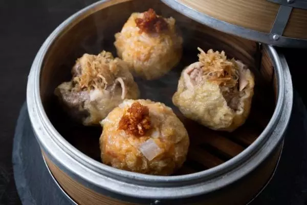 なんと皮が油揚げ!「湯葉を使ったりもしてみたけれど、少し乾燥させた油揚げが一番おいしい」と五十嵐さん。もうひとつは、みんなが大好きなエビチリを閉じ込めた焼売で満足感も抜群。