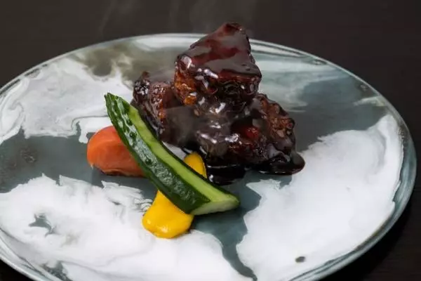「脂っこいイメージの酢豚を、あらかじめ角煮にすることで余分な脂を落としてとろりと仕上げました」というシェフの自信作。中国の鎮江酢で戻したドライマンゴーを添えて。
