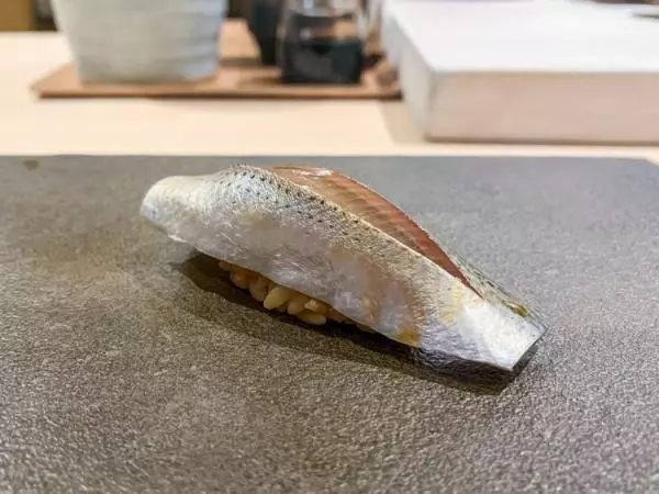 梅肉、にんにく、大葉で握っていただきました。イワシのおいしさを存分に引き出しています