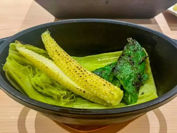 『ヤングコーンと万願寺とうがらしの焼き野菜』。信じられないほど野菜が甘く、とうもろこしのひげまでおいしくいただきました