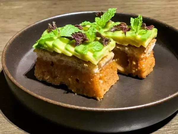 ケールの葉っぱを焼いたチップスから始まり、アボカドのトーストが登場。とても美しいトーストで、自家製のカンパーニュをたまり醤油、焦がしバターにつけカリっと焼いたものの上にスモークしたアボカドが乗せられ、ミントがあしらわれています。