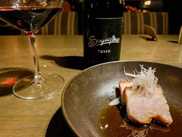 ほどなく運ばれてきたのは豚バラのグリル。皮付きの豚バラの表面はクリスピーに、中はジューシーに柔らかく火入れされたもので、三杯酢のソースがまた爽やかな深みを出してくれます。