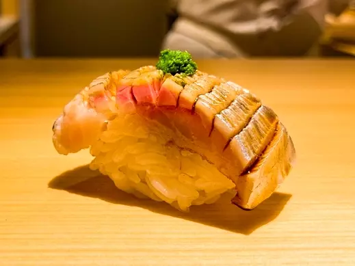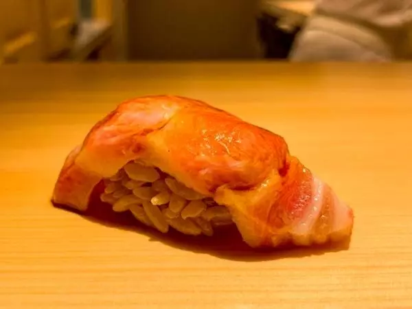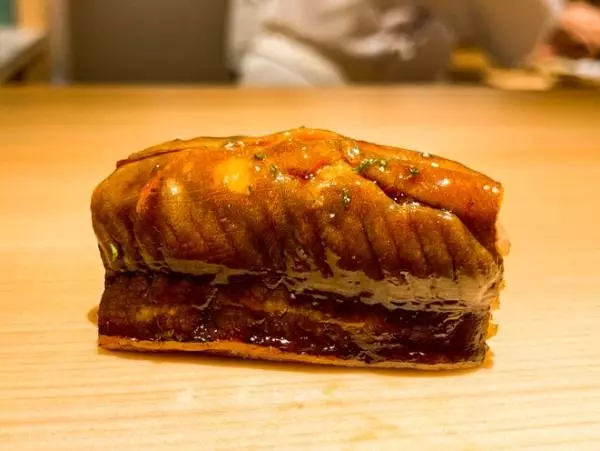 「対馬のアナゴを使います。皮目が旨いので何度も炊いて旨みを中に凝縮させてます」と、ふっくらした濃いめの味のアナゴで締め。