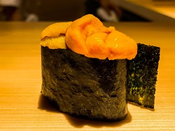そして積丹のムラサキウニとバフンウニの軍艦。ムラサキウニのクリーミーな感じとバフンウニの甘さが程よく合わさって美味。