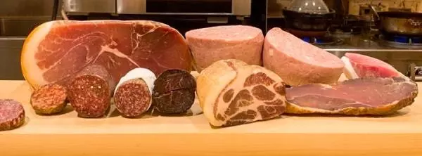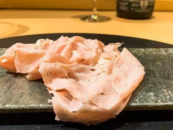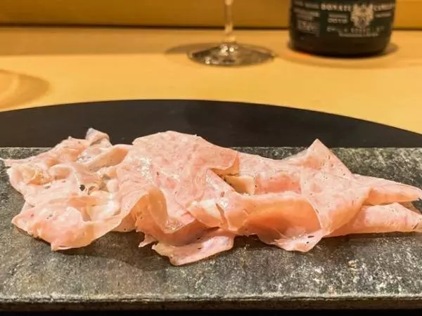 後半は自家製ハムのバリエーションを愉しみます。エミリア・ロマーニャの赤、「カミッロ ドナーティが」出され、自家製ハムが並びます。ハムは1枚1枚丁寧にスライスされ、手渡しされたりします。