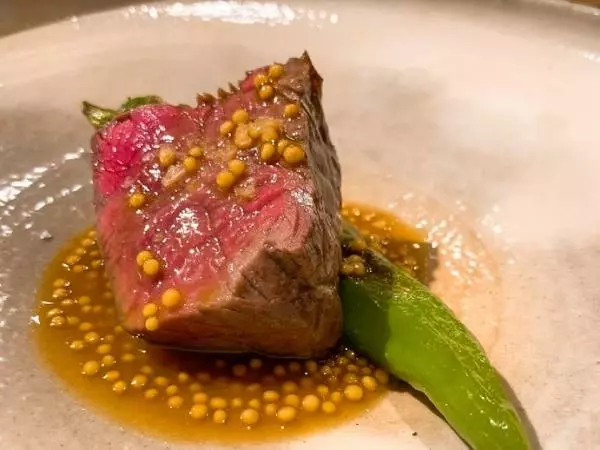 ラングドックの赤が出てきて、栗山町の菅野牧園のいちぼの炭火焼です。万願寺が添えられています。経産牛だといいますが、すっきりとした味わいのものです。オリジナルのガストリックソースが梅風味で、マスタードもいい感じ。