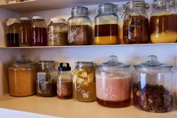 藤井シェフが育成中のさまざまな醗酵食材が廊下の棚に並ぶ。手書きの食材のイラストがSNSでバズったとか