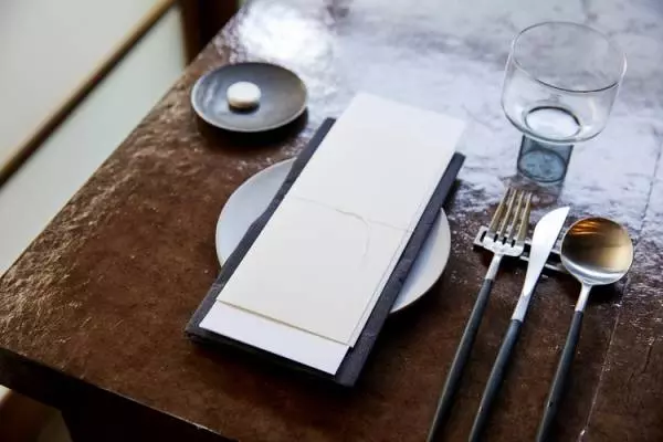 コースメニューのお品書きと一緒に添えられた藤井シェフからのメッセージの最後に、「西洋料理の技術を取り入れながら、どこか懐かしくもここにしかない味、そして日本人として生まれ培った感性を大切に。美味しさのその先にある物語を感じるような料理を目指しています」と書かれています。