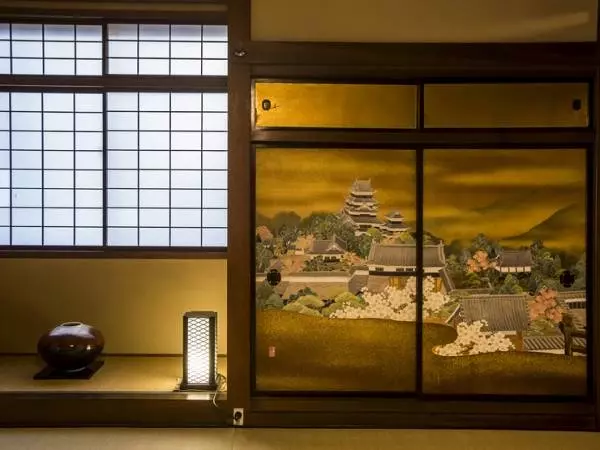 お店のこだわりは、内装や食器にもあらわれています。信州出身の手描き友禅の名士による国宝松本城や風神雷神の襖絵、お祝い仕様や「光屋」の建物を描いた屏風などが飾られ、松本文化、日本文化を堪能できます。