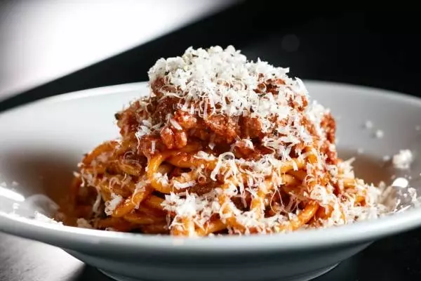 ゲストの目の前でハンバーグを崩し、ソースをかけて完成!一番人気の『名物ロデオのミートスパゲティ』