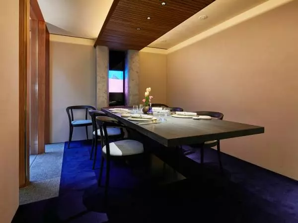 ダークネイビーの絨毯が敷き詰められた素敵な雰囲気の個室