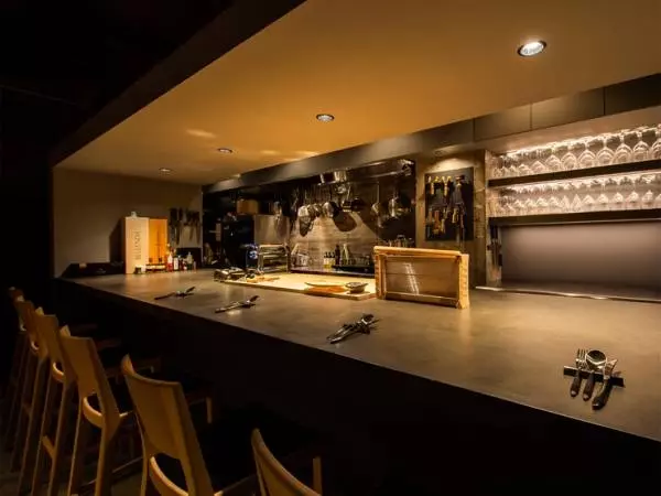 秋葉原駅からもほど近い、岩本町の裏路地に居を構える【fileja】。職人が目の前でゲストをもてなす鮨店をイメージした、カウンター席を中心に構成されたスタイリッシュな佇まいです。カウンターにはパスタマシンが設定されており、オーナーシェフがゲストの目の前で調理。パスタづくりの光景すべてを目の当たりにできます。