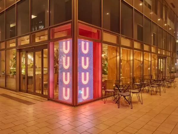 沖縄県那覇市の沖縄タイムスビル1階にある【CAFE & BAR U】。全面ガラス張りでひと際目立つおしゃれな空間で、東京・六本木にある人気イタリアン【KNOCK CUCINA BUONA ITALIANA】が監修した沖縄食材を使ったイタリア料理を提供しています。店内はグリーンも多くリゾート感溢れる雰囲気ですが、注文・配膳・会計などさまざまな場面にDXサービスを取り入れており、リラックスできる空間と便利なDXサービスが同居した珍しいお店です。