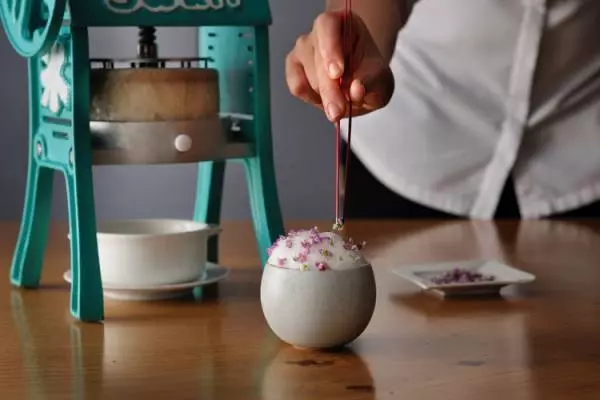 デザートの最後にはかき氷機が登場。「クワハーダ」とは、バスクの家庭で簡単にできるミルクプリンのようなもので、これに蜂蜜のかき氷を合わせることでバスクと日本の融合を表現しています。