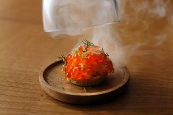 こちらはエネコシェフが日本にインスパイアを受けて仕上げた一品です。スモークをまとったそれは、サーモンのタルトレットをベースに、青ネギのエマルション、サーモンのタルタル、上にいくらを乗せています。