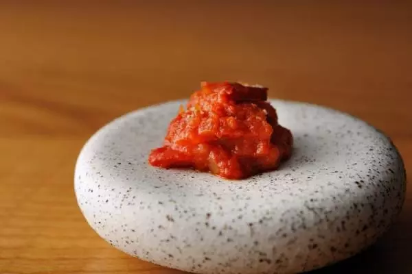 こちらもバスクの郷土料理「白カツオのトマト煮」がベースとなっています。本来は、カツオをトマトソースで煮込んだ料理ですが、日本のカツオは新鮮で、刺身がおいしいので、焼いた香ばしさと生の身質の両方を楽しめるよう、片面だけ瞬間的に焼いて半分はレア、温かい仕立てで用意しています。
