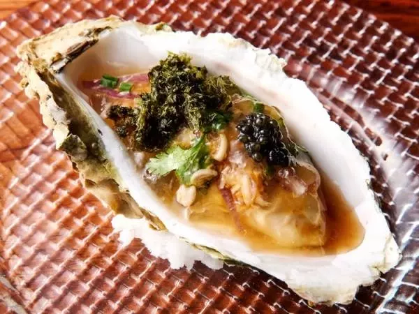 『北海道・仙鳳趾産牡蠣 醗酵トマトのライムソース キャビアと共に』「日本でも酢牡蠣にしたり、ポン酢や唐辛子をかけて食べたりするように、牡蠣と甘味、辛味、酸味は合います。つまりタイ料理にとても適した食材なんです」とオニヅカシェフ