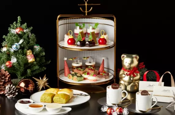 23階「ロビーラウンジ」のクリスマス限定アフタヌーンティーは、ピスタチオとグリオットチェリーのクリスマスツリーや、オーナメントをイメージした可愛らしいスイーツをはじめ、サンタクロースの帽子に見立てたグランマニエ香るポークリエットなどが、クリスマス気分を盛り上げます。ウェルカムドリンクには、世界中で愛されるプレミアムチョコレートの「リンツ」のホットショコラドリンク。お土産として持ち帰れるリンドール チョコレートが2つ入ったプチギフトも!