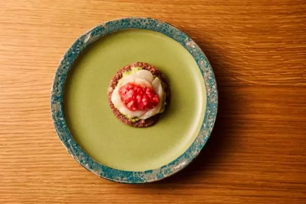 トスターダとは、カリカリになるまで揚げたトルティーヤのこと。その上にはアボカドベースのワカモレ、歯切れと食感がよい北海道産のホタテ、そしていちごのサルサをオン。サルサというとトマトが一般的ですが、いちごを使用するアイデアには脱帽。ジューシーで甘さと酸味のあるサルサと、ワカモレのまったりした味わいが口の中で調和します。