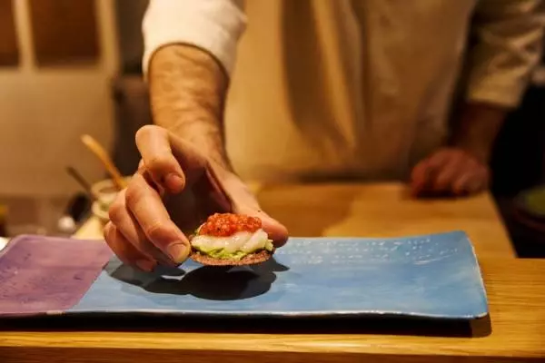 オーナーシェフのマルコ氏がタコスの次のステージを目指してオープンさせた同店。【LOS TACOS AZULES(ロス タコス アスーレス)】とのもう一つの違いとしては、夜にタコスをコースで提供するという営業スタイル。日本の寿司屋や天ぷら屋のように出来たてをそのままサーブするスタイルに感銘を受け、コンセプトをひらめいたそう。魚介を使った10品の料理が味わえる『シェフのおまかせ魚タコス』は1万5000円(税・サ込)。陶芸家の矢尾板克則氏が手がけた器との相性も抜群です。ここからコース料理の一部をご紹介します。
