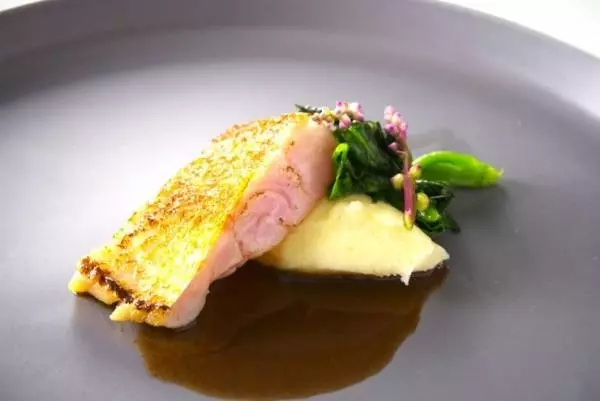 『甘鯛のうろこ焼き 甘海老出汁とブルゴーニュ地方ラドワの赤ワインソース』