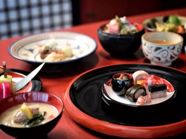 パッと目をひく鮮やかな前菜、漆が美しい器、そして繊細な包丁使いと手業を感じる仕上がり……。