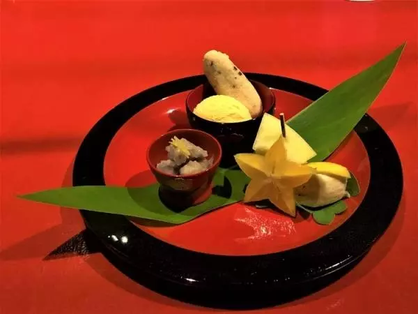 甘味は、シェフが子供の頃はお祝いの時にしか食べられなかったという思い出深い『ターンムディンガク』を含んだ現地の食材の数々。石垣島で採れるバニラビーンズを使ったバニラアイスや、大徳寺納豆を使ったオリジナルのちんすこう、島バナナ、スターフルーツなどが並びます