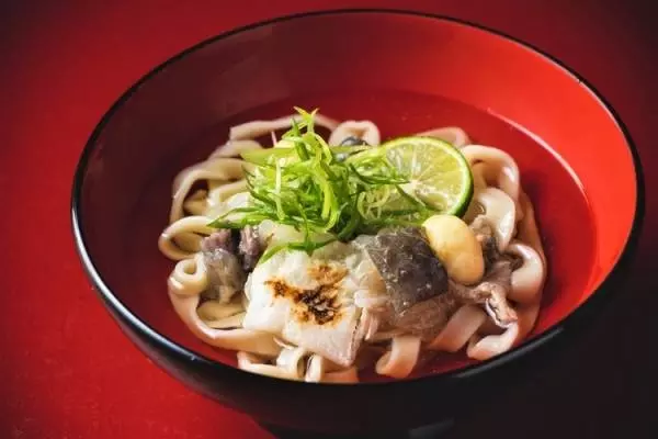 沖縄で養殖が非常に盛んな、エサにパイナップルを与えて育てている「沖縄パインすっぽん」を使用した一品。すっぽんのだし・豚のだし・マグロ節が効いています。すっぽんは非常に身が柔らかく仕上げられており、途中で酢橘や沖縄の七味を併せて軽やかに変化させられるところもおもしろい一皿です。